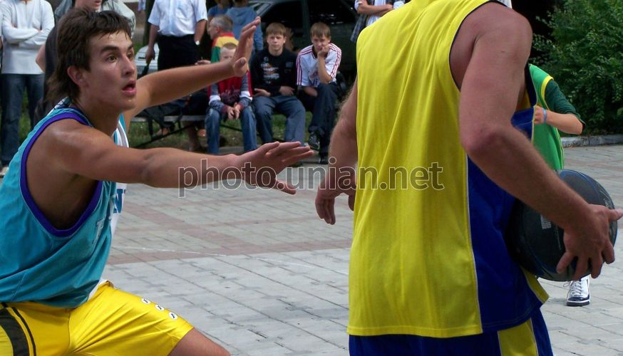 COMM Спортсмени ведуть боротьбу за м'яч під час гри зі стрітболу біля Парку культури і відпочинку в Бердичеві (Житомирська область) в неділю, 24 червня 2007 р. Цього дня в Україні святкували День Молоді. Фото Володимира Соболя / УНІАН