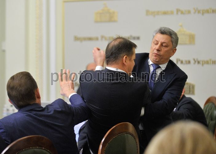 Бійка між лідером фракції Радикальної партії Олегом Ляшком і співголовою фракції "Опозиційний блок" Юрієм Бойком на засіданні Погоджувальної ради парламенту у Києві, 14 листопада 2016 р. На засіданні Погоджувальної ради парламенту сталася бійка між лідером фракції Радикальної партії Олегом Ляшком і співголовою фракції "Опозиційний блок" Юрієм Бойком. Бойко сидів поруч з Ляшком на Погоджувальній раді, коли лідер Радикальної партії Ляшко почав звинувачувати народних депутатів з фракції "Опозиційний блок", в тому числі і Бойка, в тому, що вони їздять в Росію за вказівками. Після цього Бойко піднявся зі свого місця і кілька разів ударив Ляшка. Ляшко, по суті, лише захищався, не даючи здачі у відповідь. Потім Бойко ще раз почав бійку, коли Ляшко запитав, чому такі, як Бойко, не сидять у в'язниці, а також заявив, що депутати з "Опоблоку", зокрема, Бойко, є "недобитками Януковича". Фото Струмковський Володимир / УНІАН
