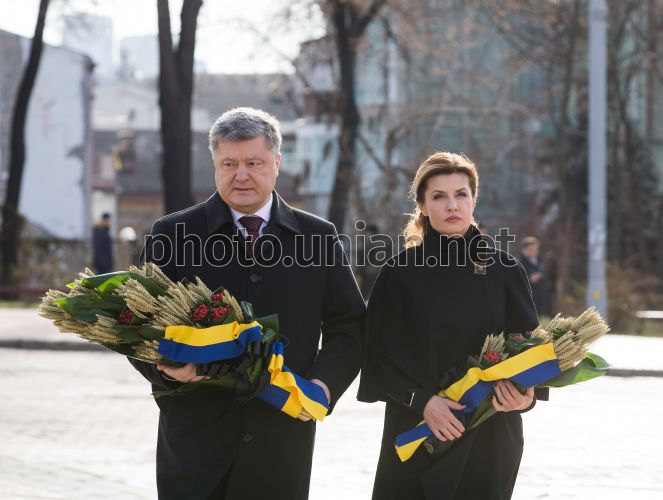 Президент Петро Порошенко разом із дружиною Мариною поклали композиції з колосків та калини до підніжжя Пам’ятного знаку жертвам Голодомору в День пам'яті жертв голодоморів, на Михайлівській площі у Києві, 26 листопада 2016 р. Фото Марків Михайло / POOL / УНІАН