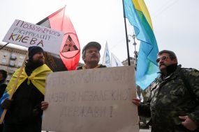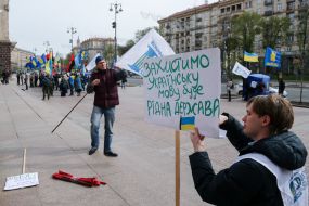 Учасники пікету біля КМДА в Києві, 20 квітня 2017 р. У цей день в Києві ВО "Свобода" провела пікет КМДА, де на засіданні Київради розглядався проект рішення голови фракції ВО" Свобода "Юрія Сиротюка про застосування української мови в сфері обслуговування. Фото Ратинський В'ячеслав / УНІАН