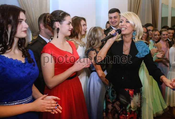 Співачка, Заслужена артистка України Астрая (Олена Петрова), в центрі, виступає під час щорічного "Ліцейного балу", у Київському військовому ліцеї імені Івана Богуна, 1 грудня 2017 р. У цей день у столиці відбувся традиційний, щорічний "Ліцейний бал", присвячений річниці Збройних Сил України. Фото Синиця Олександр / УНІАН