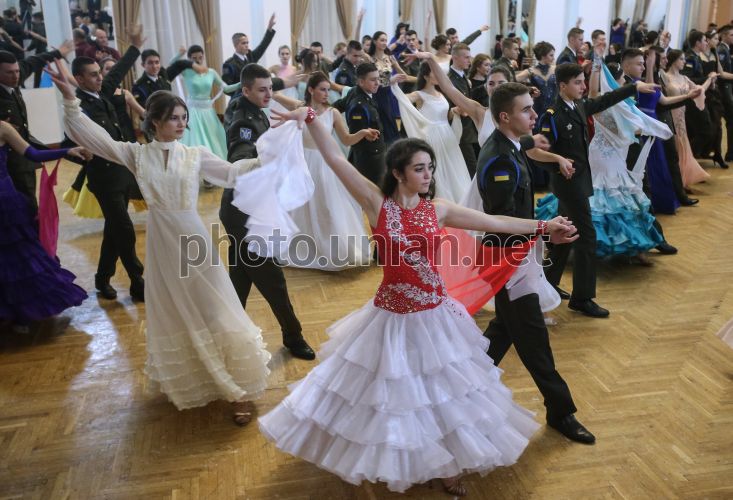 Учасники щорічного "Ліцейного балу" танцюють вальс, у Київському військовому ліцеї імені Івана Богуна, 1 грудня 2017 р. У цей день у столиці відбувся традиційний, щорічний "Ліцейний бал", присвячений річниці Збройних Сил України. Фото Синиця Олександр / УНІАН