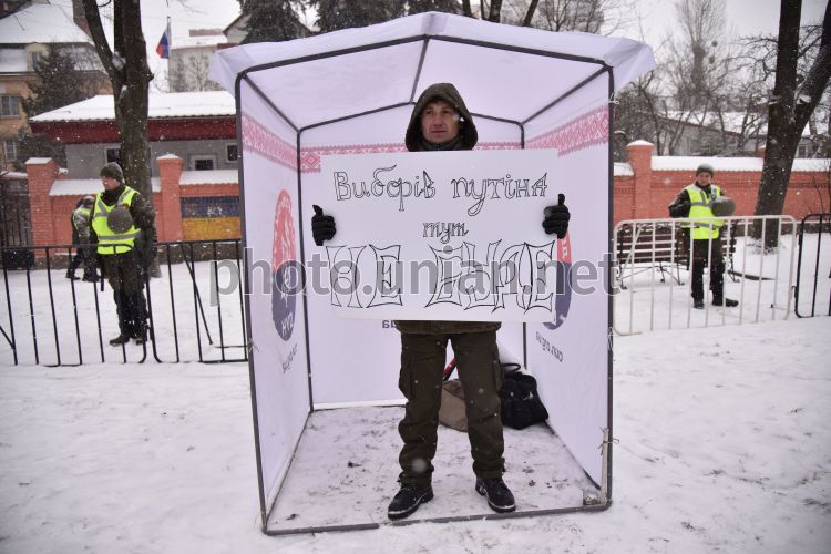 Чоловік з плакатом "Виборів Путіна тут не буде" біля намету, який встановлена поруч з консульством Російської Федерації, у Львові, 18 березня 2018 р. У цей день у Львові будівлю російського консульства співробітники поліції спільно з Національною гвардією огородили металевим парканом. Крім того, представники руху "Національний корпус" поставили біля будівлі бочки і намет. Фото УНІАН