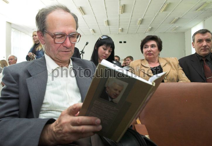 Чоловік читає книгу Голови Верховної Ради 5-го скликання Олександра Мороза під час його виступу в рамках зустрічі зі студентами та викладачами Дніпродзержинського державного технічного університету в рамках робочого візиту до Дніпродзержинську (Дніпропетровська обл.), у вівторок, 18 вересня 2007 р. Фото Анастасії Сироткіної / УНІАН