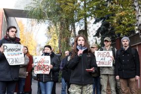 Учасники тримають плакати під час акції "АТОвці проти пропаганди Кремля, час закривати "112" та NewsOne!" біля РНБО, в Києві, 6 листопада 2018 р. Цього дня під стінами РНБО учасники ООС (раніще АТО) та активісти вимагали ввести санкції проти телеканалів "112", "Україна" та "Newsone". Фото Ратинський В'ячеслав / УНІАН
