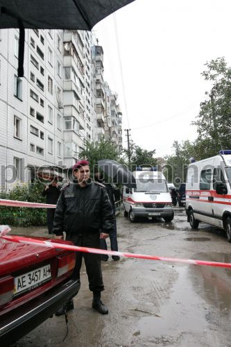 Рятувальник біля будинку, зруйнованого через вибух побутового газу в Дніпропетровську, в суботу, 13 жовтня 2007 р. Зруйновано половину десятиповерхового житлового будинку, розташованого на масиві Перемога, вул. Мандриківська, 127. За свідченнями очевидців, вибух стався сьогодні в одній з квартир під’їзду посеред будинку, о 10.45 ранку. Над двома під’їздами зірвало дах. Пожежі на місці вибуху не було. Рятувальники евакуюють людей з прилеглих до місця вибуху квартир. Ніхто з офіційних осіб наразі не коментує цю надзвичайну подію. Біля зруйнованого будинку працюють рятувальні служби МНС та міліція. За попередніми даними восьмеро людей загинули, 18 – травмовано. Про це журналістам повідомив представник Управління охорони здоров’я Дніпропетровської міської ради, додавши, що серед постраждалих є троє дітей. Рятувальники МНС продовжують розбирати завали у будинку, що постраждав в результаті вибуху . У сусідніх будинках вибуховою хвилею вибито шибки. В усіх будинках житлового масиву відключено газ та воду. Як повідомили в прес-службі МНС, в Києві проходить засідання керівництва Міністерства надзвичайних ситуацій, оперативна група готується вилетіти до Дніпропетровська. За попередньою версією, причина вибуху – необережне використання побутового газу. Фото Євгена Арсеньєва / УНІАН