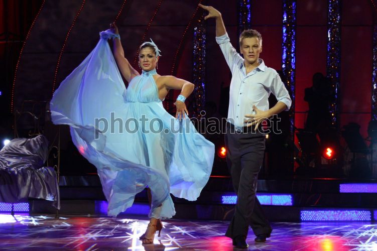 Актор Марчин Мрочек (Польща) і його партнерка чемпіонка Світу, неодноразова чемпіонка України, учасниця проекту «Танці із зірками-3» Анна Пелипенко танцюють під час зйомок телепроекту «Танці із зірками-3» в Києві у суботу, 13 жовтня 2007 р. Особливість проекту «Танці із зірками-3» — міжнародний склад учасників. Фото Алли Демури / УНІАН