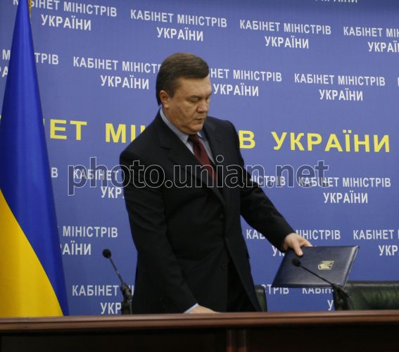 Прем’єр-міністр України Віктор Янукович перед брифінгом в Кабінеті Міністрів з приводу того, що Україна визначиться з можливістю висунення претензій до Росії з приводу аварії, що спричинила екологічні наслідки в Керченській протоці, після отримання результатів технічної експертизи, в Києві у понеділок, 12 листопада 2007 р. Фото УНІАН