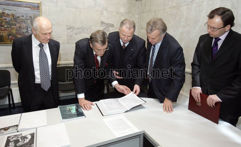 Президент України Віктор Ющенко, другий зліва, переглядає експонати документально-художньої виставки "Україна пам’ятає! Голодомор 1932-1933 рр. - геноцид Українського народу" в Києві, в п’ятницю, 23 листопада 2007 р. Метою виставки є висвітлення геноциду українців 1932-33 рр., який проводив більшовицький режим СРСР на чолі з Й. Сталіним. Аналоги таких подій у світовій історії знайти важко, адже методом масового знищення людей було обрано голод. На виставці представлені документи вищих партійних і державних органів влади, які свідчать про їхні свідомі дії, спрямовані на організацію Голодомору, та їхню повну обізнаність з ситуацією на місцях. Фото Миколи Лазаренка / POOL / УНІАН