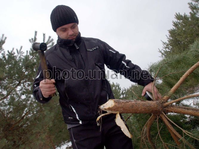 Старший лісничий клеймить ялинку для новорічного продажу в одному з лісгоспів Харківської області в четвер, 20 грудня 2007 р. Фото Володимира Андрєєва / УНІАН