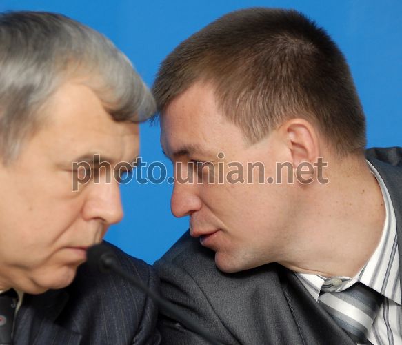 Директор департаменту НАК “Нафтогаз України” В’ячеслав Хрушков, ліворуч, та генеральний директор спільного українсько-канадського підприємства ”Каштанпетролеум” Олександр Білека на прес-конференції в УНІАН на тему: ”Чому Мінфін вже вкотре намагається наповнити держбюджет за рахунок руйнації нафтогазової галузі України?” у Києві у вівторок, 25 грудня 2007 р. Фото Дмитра Стаховського / УНІАН