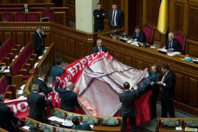 Плакат із зображенням Тимошенко в залі засідань ВР України